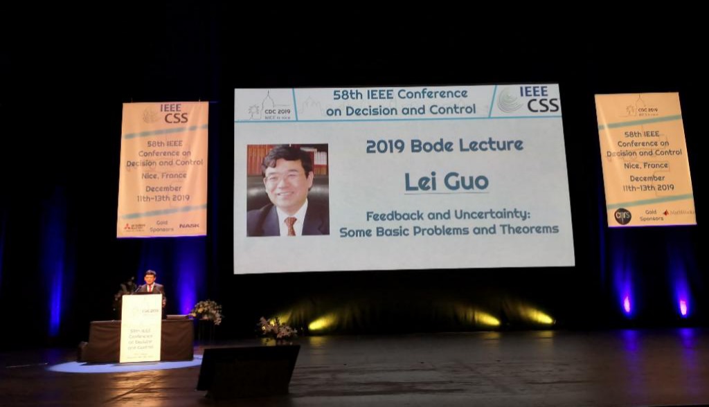 2019年12月11-13日,国际控制系统领域影响最大的年度会议“IEEE决策与控制大会”(CDC’2019)在法国尼斯召开,会议注册代表近二千人。会议期间,IEEE控制系统学会举行了年度颁奖典礼,学会顾问委员会主任、前任理事长郭雷院士“因在自适应控制、系统辨识、自适应信号处理、随机系统及应用数学领域的根本性和实际性贡献(For fundamental and practical contributions to the field of adaptive control, system identification, adaptive signal processing, stochastic systems, and applied mathematics)” ,被授予2019年Hendrik W. Bode Lecture Prize(简称波德奖),并作了本次会议唯一的大会报告“波德讲座(Bode Lecture)”。